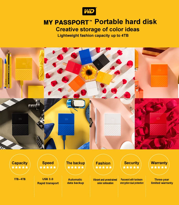 웨스턴 디지털 마이 패스포트 HDD, USB 3.0, 휴대용 외장 하드 드라이브 디스크, 2TB, 4TB
