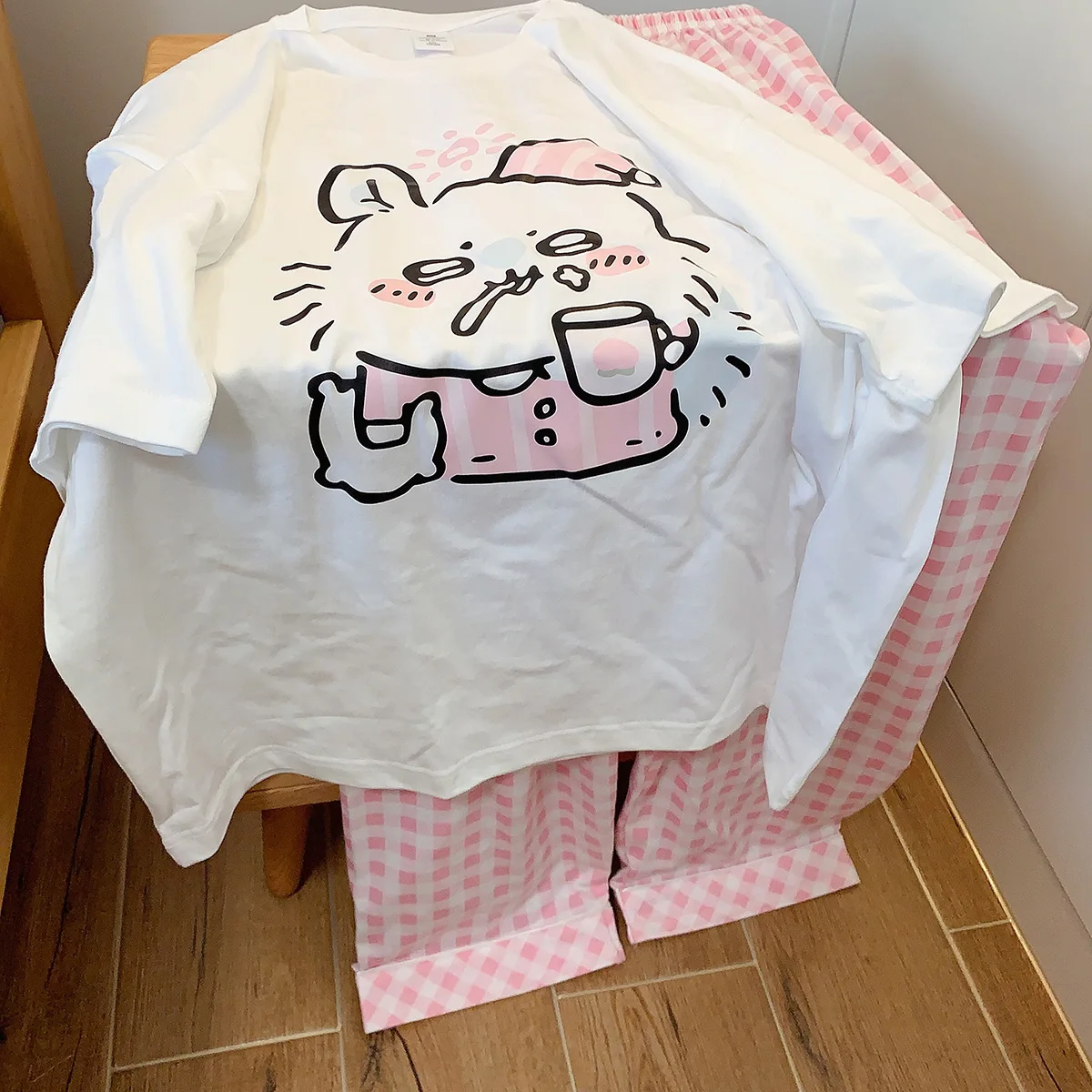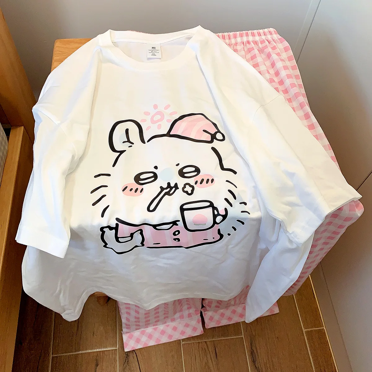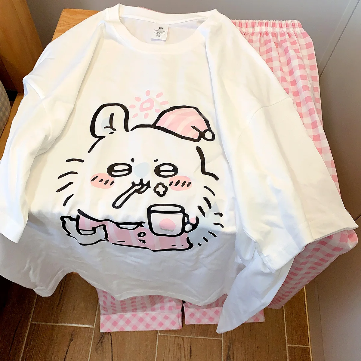 Chiikawa 여성 여름 코튼 잠옷 세트 라운드 넥 반팔 캐주얼 풀오버 투피스 세트 외부 착용 가능