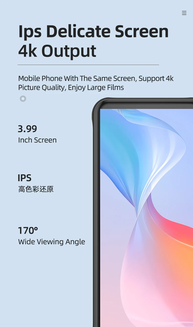 디스플레이 화면: 4.0 인치 IPS 고화질 디스플레이 해상도: 400*960