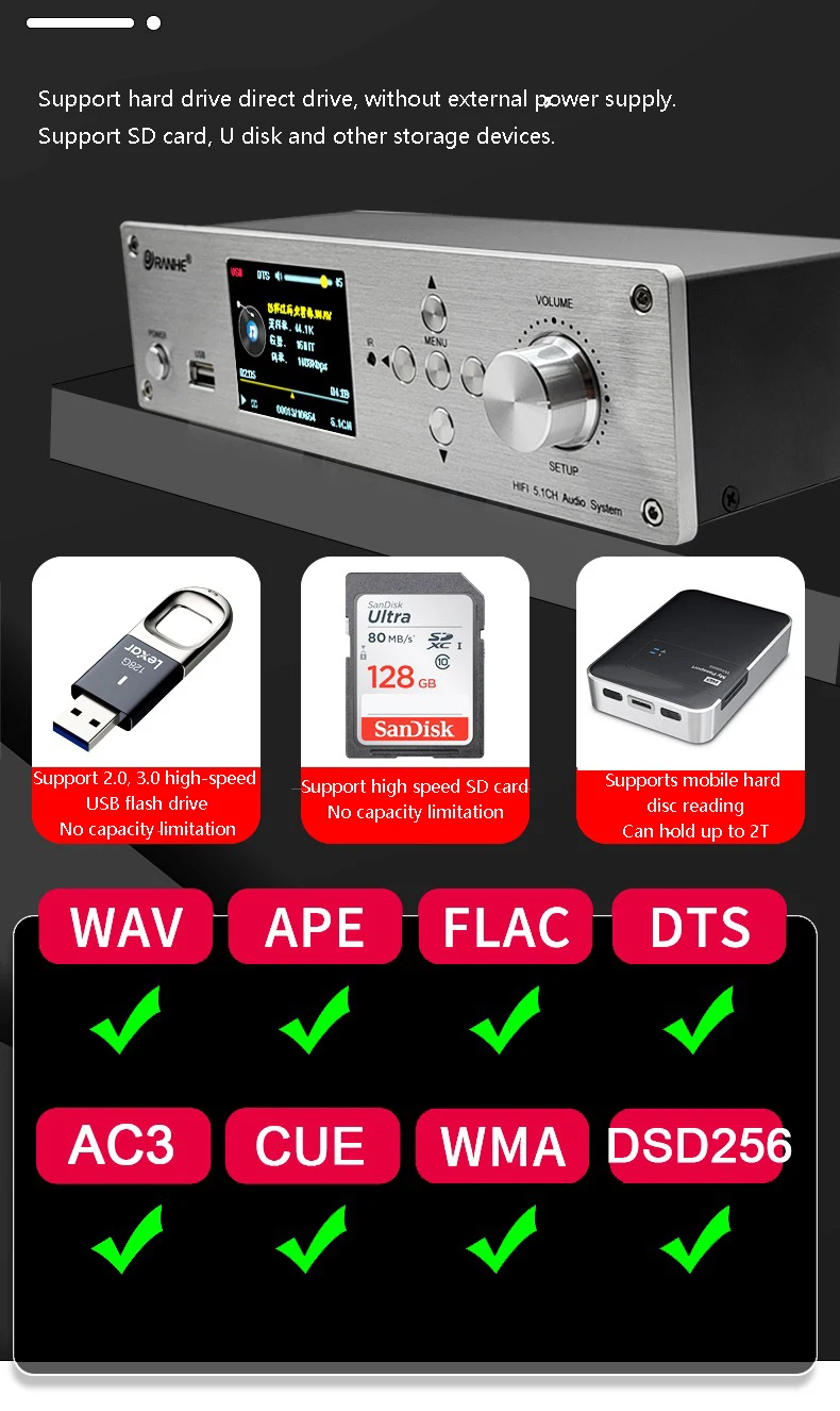 지원 DSD, DTS, WAV, AC3, APE, FLAC, MP3 및 기타 무손실 음악 재생 4.